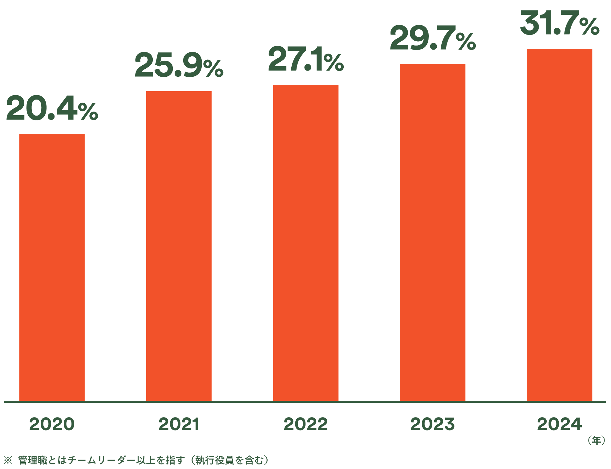 現状、女性管理職(チームリーダー以上)比率は31.7%となっており、全メンバーに占める女性比率の43.8%とのギャップは縮まってきています。